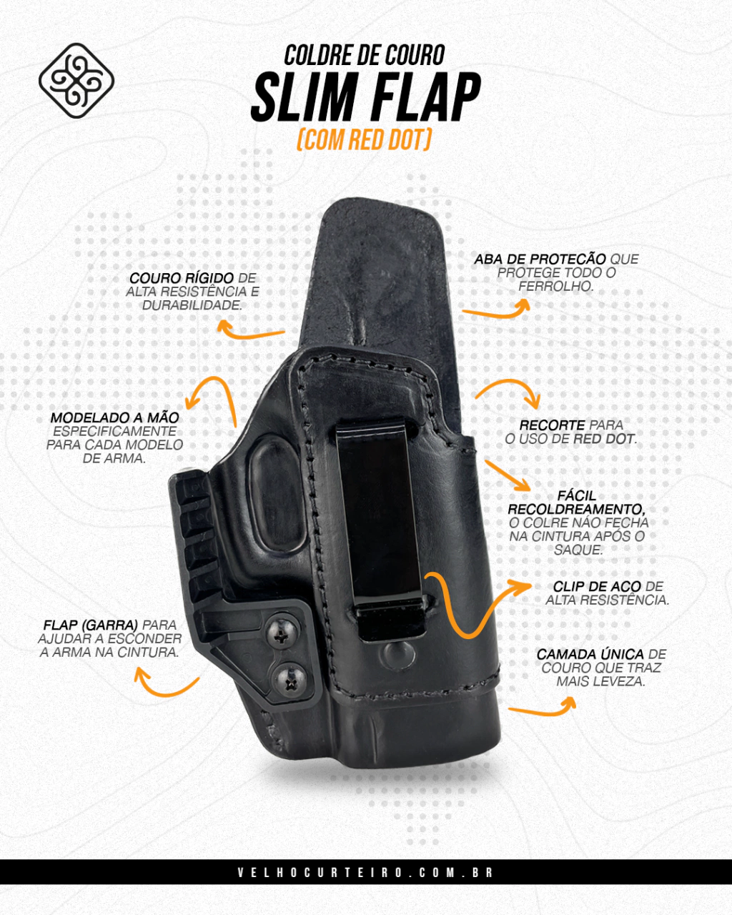 Devido a modelagem feito à mão pelos artesões, o coldre tem um encaixe ideal para o modelo da sua arma, trazendo suavidade e retenção ideal na cintura durante o saque rápido. com um clipe de metal associado ao flap você terá descrição durante o porte com o conforto da linha SLIM.